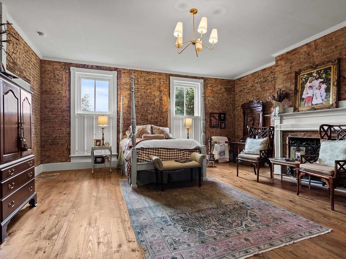 This inviting master bedroom blends rustic charm with modern comfort, featuring exposed brick walls that add character and warmth. A wrought-iron canopy bed is adorned with plush bedding, creating a cozy sanctuary. Natural light floods the room through large windows, complemented by soft, ambient lighting from an elegant chandelier. The polished hardwood floors contrast beautifully with the ornate antique rug, enhancing the room’s inviting feel. Family-friendly touches include a vintage armchair and a chest of drawers, perfect for storage. Framed family photos and decorative accents personalize the space, offering a peaceful retreat for relaxation and connection.