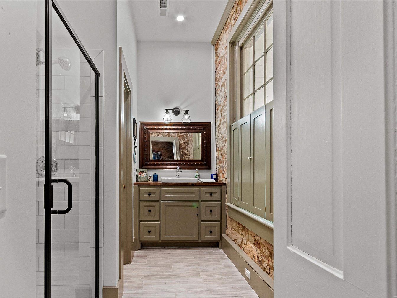 This bathroom showcases a harmonious blend of modern design and rustic charm. The layout features a spacious walk-in shower with sleek glass doors, complemented by elegant black hardware. A double-sink vanity, painted in a soft green hue, offers ample storage, while the rich wood countertop adds warmth. Above the vanity, a vintage-style mirror reflects natural light, enhancing the room’s airy feel. Exposed brick accents contrast beautifully with the fresh white walls, creating a stylish focal point. With carefully selected lighting fixtures, the space feels both inviting and functional, perfect for family use.