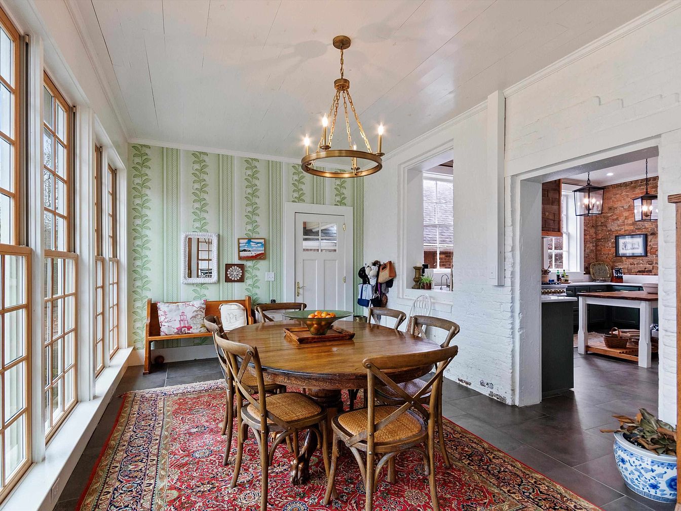 This inviting dining room features a round wooden table surrounded by charming, rustic chairs, creating a warm atmosphere for family gatherings. Soft green wallpaper with delicate leaf patterns complements the natural light pouring in through large windows, enhancing the airy feel. A vibrant Persian rug adds a splash of color underfoot, connecting the space with a sense of coziness. Architectural details, including a classic chandelier and exposed brick in the adjoining kitchen, blend vintage and modern styles effortlessly. A convenient bench along one wall invites casual seating, making this room perfect for everyday meals and celebrations alike.