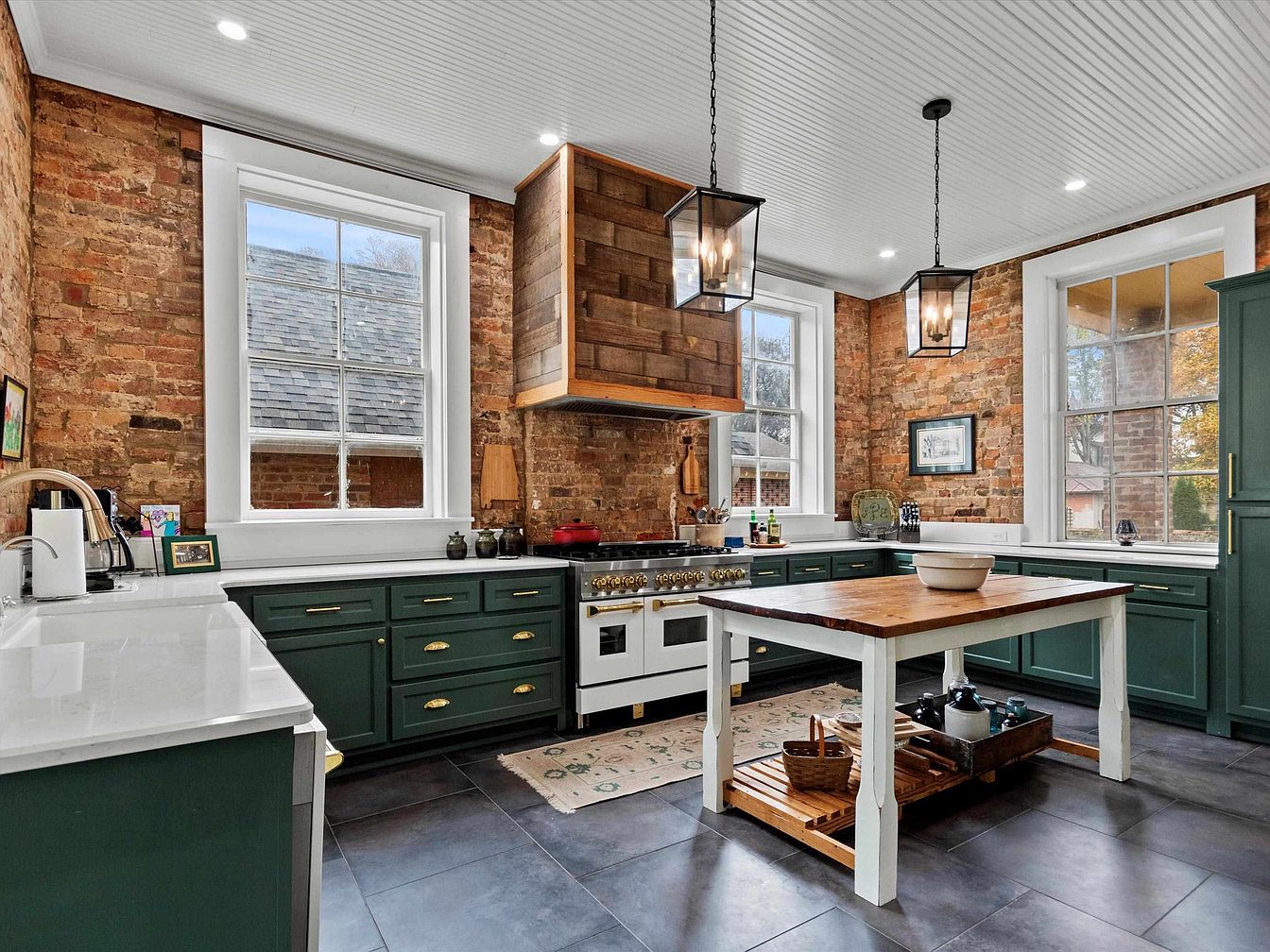 This inviting kitchen showcases a blend of rustic charm and modern elegance. Exposed brick walls lend warmth and character, framed by large, well-placed windows that flood the space with natural light. The deep green cabinetry pairs beautifully with sleek white countertops, providing ample storage and workspace. A central wooden island, featuring a natural finish and practical open shelving, is perfect for casual gatherings. Unique pendant lighting adds a stylish touch, while the classic stove enhances the culinary ambiance. The dark tiled flooring contrasts elegantly with lighter elements, making this kitchen ideal for family activities and entertaining.