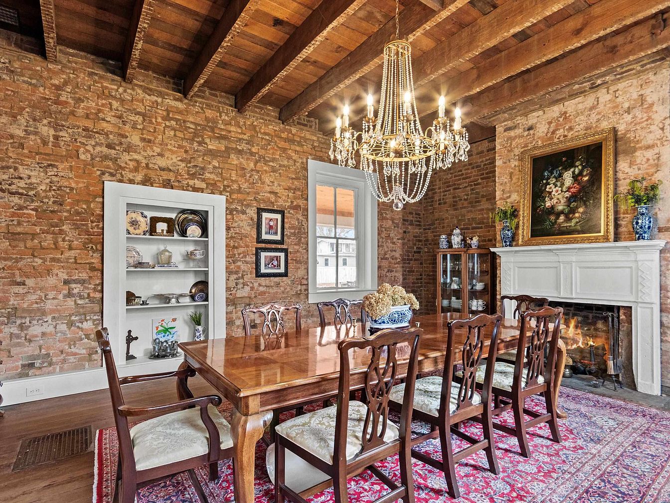 This inviting dining room features a stunning mahogany table set against a backdrop of exposed brick walls, showcasing rustic charm. The elegant chandelier hangs gracefully from the beamed ceiling, casting a warm glow across the space. Plush chairs with intricate detailing surround the table, creating a welcoming atmosphere for family gatherings. A cozy fireplace adds a touch of warmth, while a built-in china cabinet displays fine dishware. Rich colors of the Persian rug harmonize with the earthy tones of the bricks, enhancing the room’s cozy yet sophisticated feel, perfect for intimate dinners or festive celebrations.