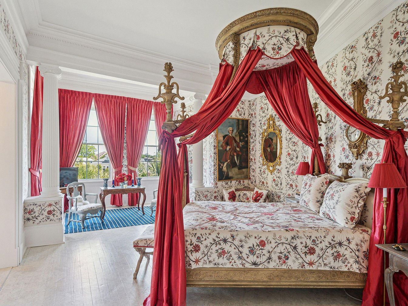 A grand bedroom filled with natural light from tall sash windows, anchored by a regal four-poster canopy bed draped in vibrant red fabric. Traditional floral wallpaper and matching bedding add classic elegance, while ornate gold-framed portraits and antique mirrors provide period charm. Rich crimson curtains and accents infuse warmth and drama, balanced by crisp white trim and stately columns. A cozy seating area with vintage chairs and a writing desk forms a family-friendly nook, ideal for relaxing, reading, or study. The overall effect is one of sophisticated comfort and timeless beauty, perfect for an inspiring family sanctuary.