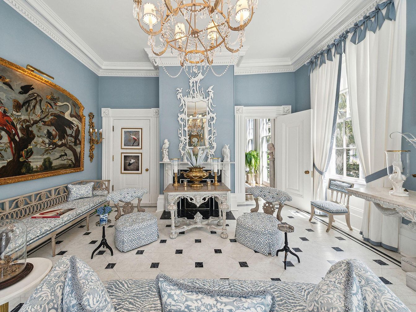 Flooded with natural light from tall, draped windows, this refined sitting room features a soft, powder blue and white palette that evokes calm and sophistication. Plush patterned ottomans and benches offer comfortable, family-friendly seating around an ornate, carved console table. Crown molding, detailed wall trim, and a stunning gold chandelier add architectural grandeur. Framed art and a large nature-inspired painting provide visual interest, while decorative mirrors and statues enhance the ambiance. The marble floor with checkered accents grounds the space, making it both elegant for guests yet inviting enough for family gatherings, reading, or leisurely afternoons.