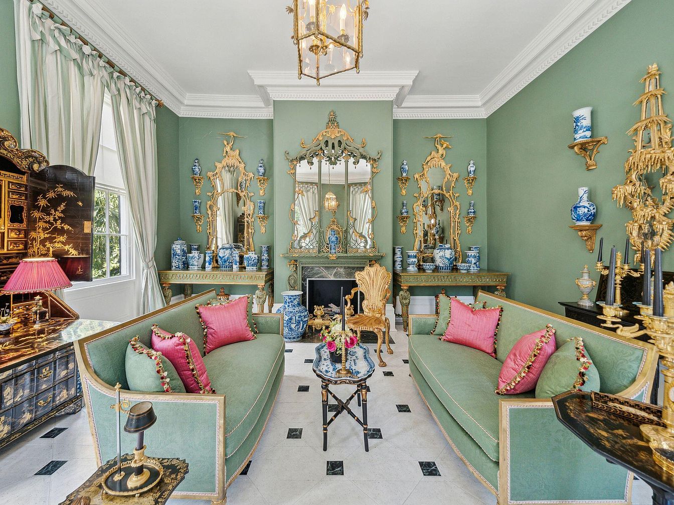 A stately formal living room featuring exquisite neoclassical design elements and a family-friendly conversational layout. Soft sage green walls set a calming tone, complemented by floor-to-ceiling windows dressed in breezy, striped drapes that flood the space with natural light. Elegant gold-trimmed sofas are adorned with vibrant fuchsia pillows, providing a pop of color and comfortable seating for the entire family. Ornate gilded mirrors and blue-and-white porcelain vases line the fireplace and accent tables, creating visual interest and a sense of history. Thoughtful decorative touches, such as chinoiserie cabinets and detailed molding, add timeless sophistication to this inviting gathering space.
