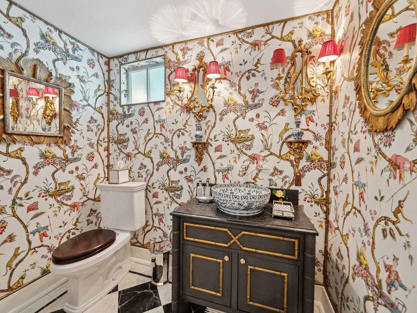 This powder room features a whimsical Chinoiserie-inspired wallpaper covered in colorful birds, branches, and playful monkeys, creating a vibrant and engaging atmosphere for guests and family members alike. Classic black-and-white checkerboard flooring grounds the space, while the dark wood vanity with gold trim exudes sophistication. Above, elegant wall sconces with red pleated shades cast a warm glow, and ornate gold mirrors enhance the luxurious feel. The vessel sink with blue-and-white porcelain patterns adds distinctive charm. This visually rich and inviting design makes the bathroom both functional and delightful for visitors of all ages.