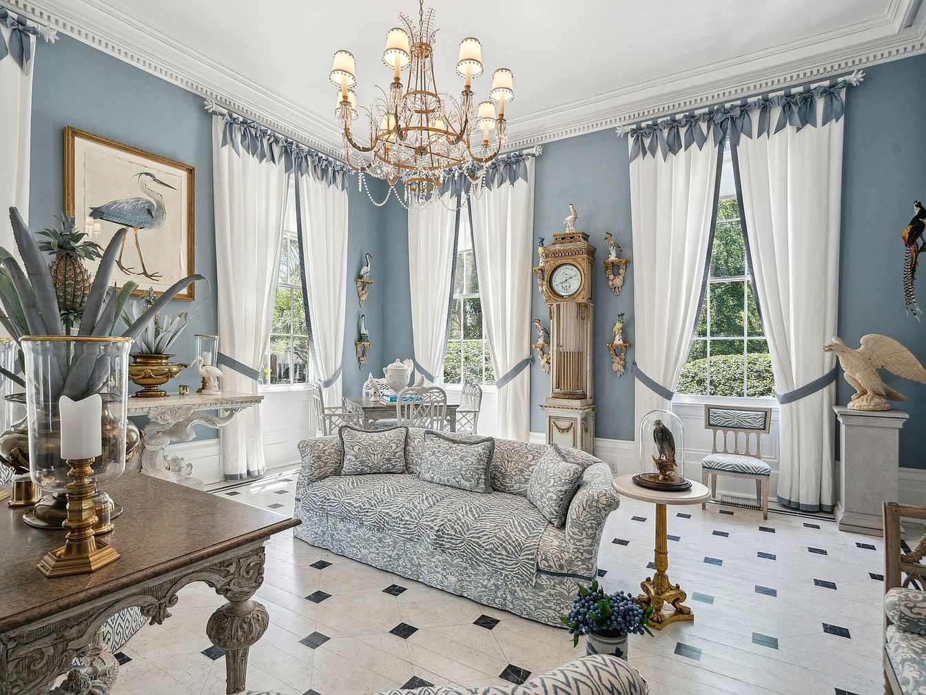 This living room exudes classic sophistication with its soft blue walls and white wainscoting, enhanced by grand floor-to-ceiling windows dressed in flowing white curtains with blue valance detailing. A plush patterned sofa sets the stage for comfort, complemented by antique-style side tables, a decorative fireplace console, and a stunning grandfather clock. The space feels airy and family-friendly, perfect for gatherings or relaxing afternoons, offering plenty of seating and open floor space. Gold accents, an ornate chandelier, and curated bird-themed art create a refined ambiance, while thoughtful touches like sculpted plants and whimsical sculptures add approachable charm and visual interest.