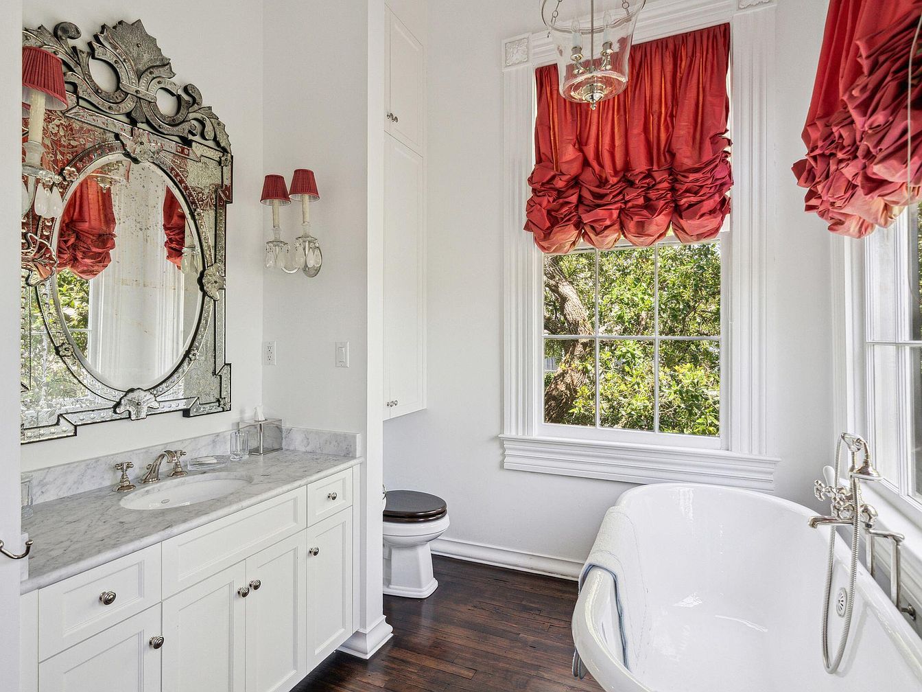 Elegant and inviting, this bathroom features a freestanding soaking tub positioned next to oversized windows that allow natural light to pour in, complemented by lush views of greenery from outside. The white marble vanity, adorned with polished silver fixtures and classic cabinetry, pairs effortlessly with the ornate vintage mirror above it. Rich, dark hardwood floors contrast beautifully against the crisp white walls and cabinetry, while bold red Roman shades add a dramatic pop of color and sophistication. Subtle, child-safe fixtures and ample storage make this space practical for families, balancing timeless luxury with everyday comfort.