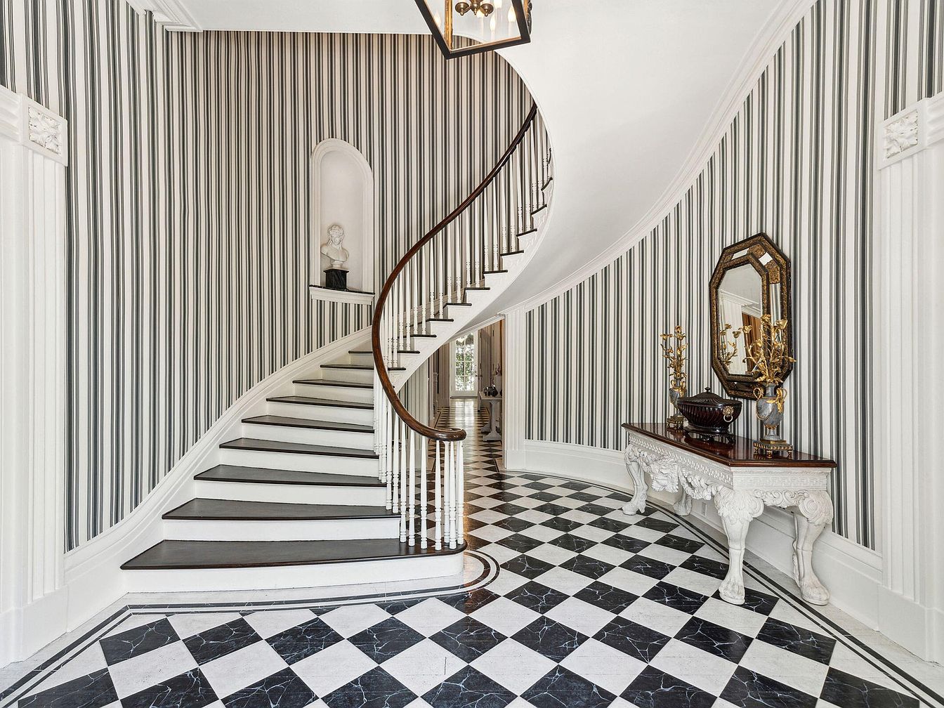 A stunning entryway features a sweeping curved staircase with dark wooden treads and crisp white risers, seamlessly drawing the eye upward. The classic black and white checkerboard marble flooring offers a timeless feel, while vertical striped wallpaper in neutral tones adds height and sophistication to the space. An ornate console table with intricate carvings is complemented by a decorative mirror and elegant gold accents, providing both function and style. There’s a built-in niche showcasing a sculpture for an artful touch. The open and inviting layout makes this entry suitable for families and guests, blending grandeur with everyday practicality.