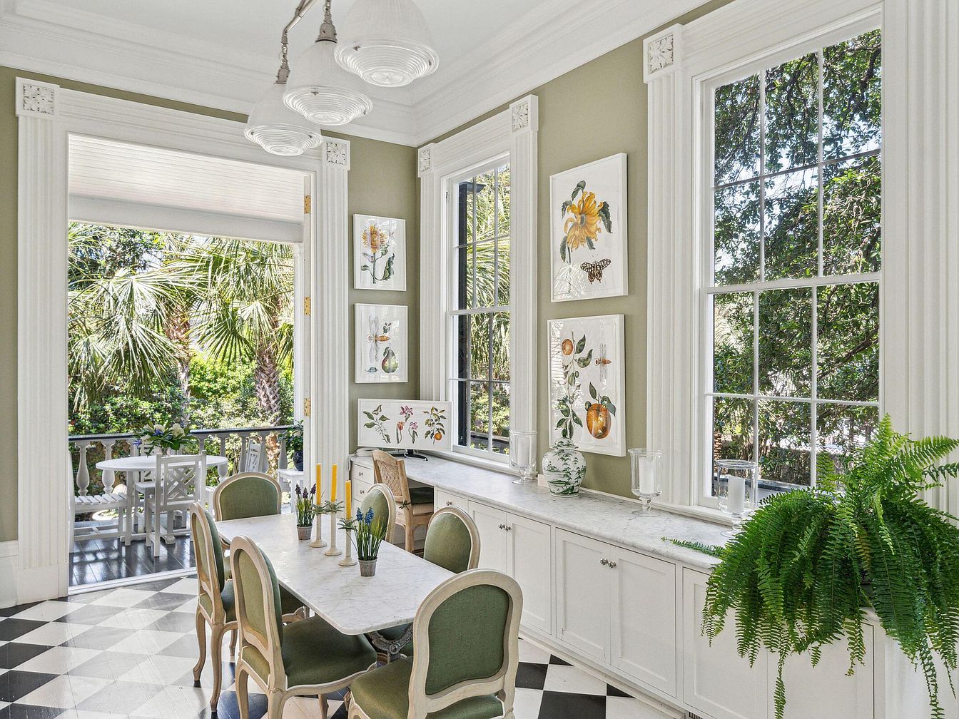 This airy dining area boasts large, sun-filled windows showcasing lush greenery outside, making it feel both connected to nature and inviting for gatherings. The room’s tall white trim and classic moldings evoke a sense of historic charm, while soft sage walls and black-and-white checkered floors add visual interest and warmth. A marble-topped table with elegant green-upholstered chairs provides ample seating for family meals or entertaining guests. The built-in cabinetry is perfect for storage, and botanical artwork complements the surrounding landscape. The layout encourages conversation and comfort, ideal for daily use by all ages and effortless transitions to the outdoor patio.