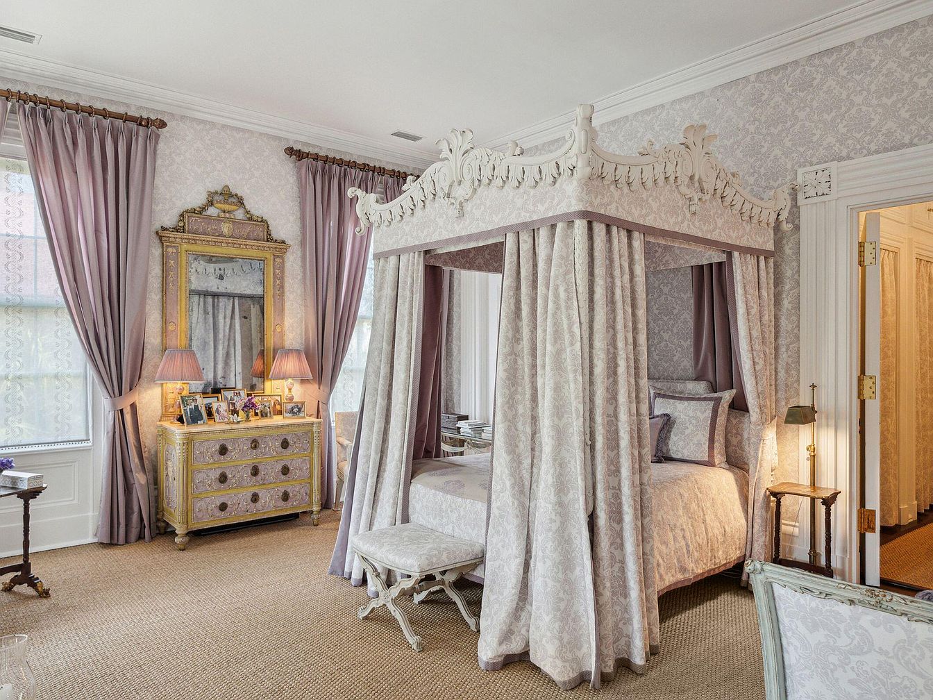 This elegant bedroom features a grand four-poster canopy bed adorned with intricate moldings and soft, patterned drapery, creating a cozy, private retreat. The color palette embraces soft purples and creams, echoed in the luxurious curtains and bedding. A vintage-inspired dresser topped with framed family photos brings warmth and personality, while matching lavender-lamp shades offer soft, inviting lighting. The intricate wallpaper and detailed molding add timeless sophistication, while cushioned seating and a plush textured carpet make the room family friendly and comfortable. The overall effect is a perfect blend of classic elegance and welcoming tranquility, ideal for unwinding together.
