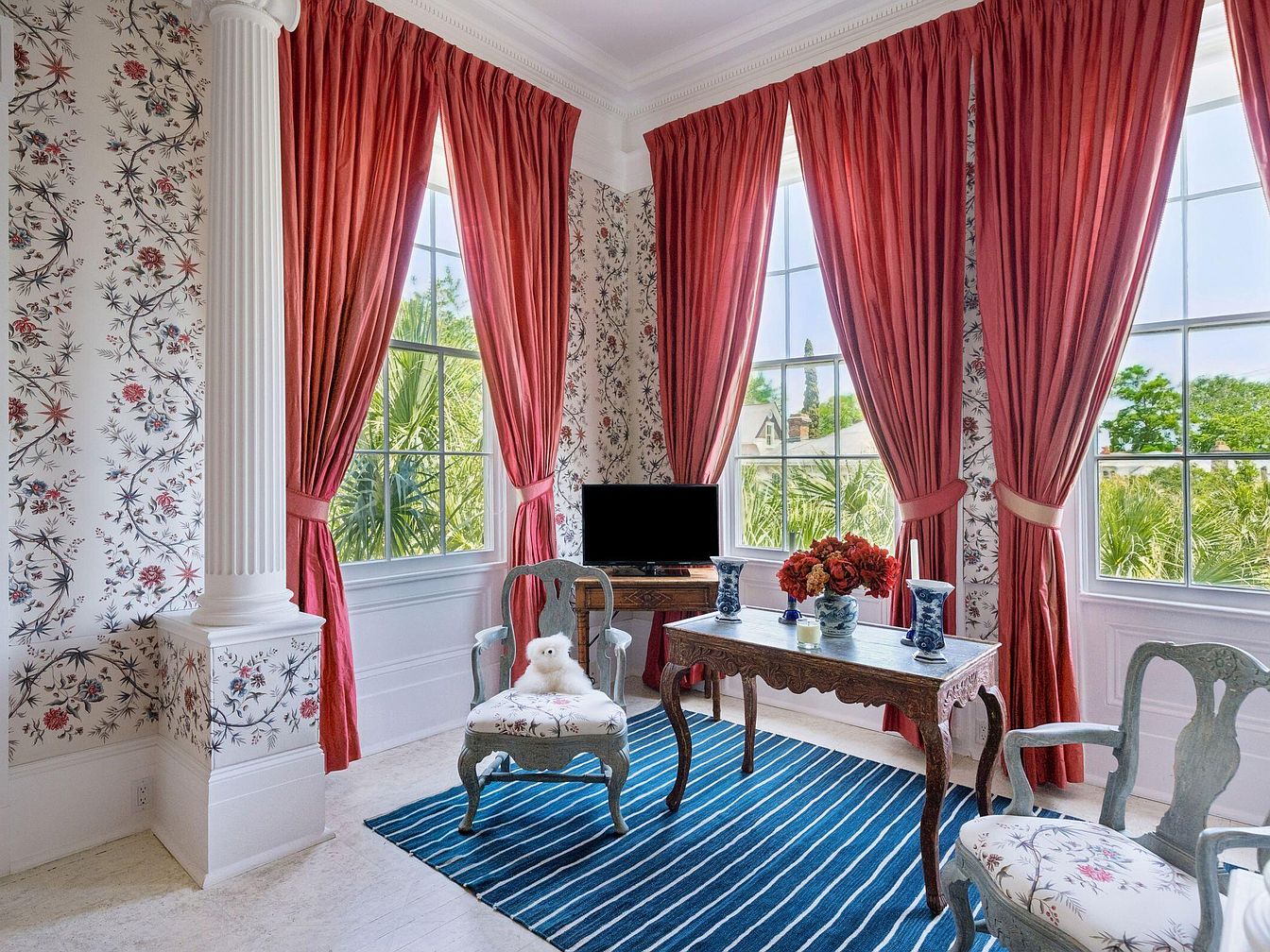 A bright and elegant sunroom designed for relaxation and family time, featuring expansive windows that flood the space with natural light and offer lush garden views. Sophisticated floral wallpaper pairs beautifully with classical architectural details, such as a stately column and intricate crown molding. Rich coral drapes bring warmth and a touch of drama, while a deep blue striped rug anchors the room. The vintage-style chairs, adorned with matching floral upholstery, create a welcoming spot for conversation or reading. A charming writing desk, fresh flower arrangement, and a plush stuffed animal add homey, family-friendly touches to the open yet intimate layout.