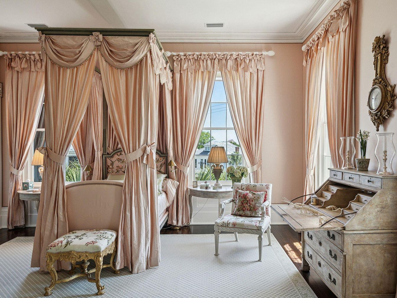 This spacious bedroom showcases a romantic four-poster bed framed with soft blush drapes, creating a sense of intimacy and old-world charm. Light streams through large windows dressed in matching curtains, filling the space with natural warmth. The ornate wooden writing desk and antique-style clock accentuate the classic elegance, while floral patterns on the chair and bench lend a welcoming, family-friendly touch. Pale pink walls, a plush white area rug, and delicate vintage furniture pieces complete the serene palette, fostering a cozy yet sophisticated retreat well-suited for comfort and relaxation. The layout encourages both privacy and openness.
