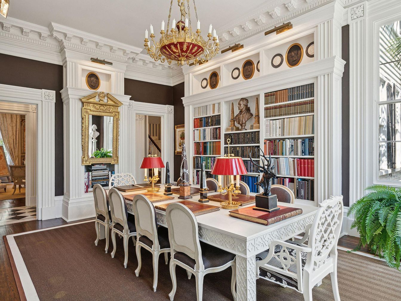 A beautiful blend of sophistication and comfort, this library dining room features an ornate white coffered ceiling and detailed moldings, paired with dark walls that showcase built-in bookshelves lined with an impressive array of volumes. An elegant white dining table, surrounded by carved chairs and comfortable seating for eight, sets a welcoming environment for family gatherings or study sessions. Warmth is added with rich brown carpeting and natural light streaming through tall windows. The centerpiece chandelier and gold-framed mirror add grandeur, while family-friendly elements such as sturdy furniture and ample table space make it perfect for children’s homework and group activities.
