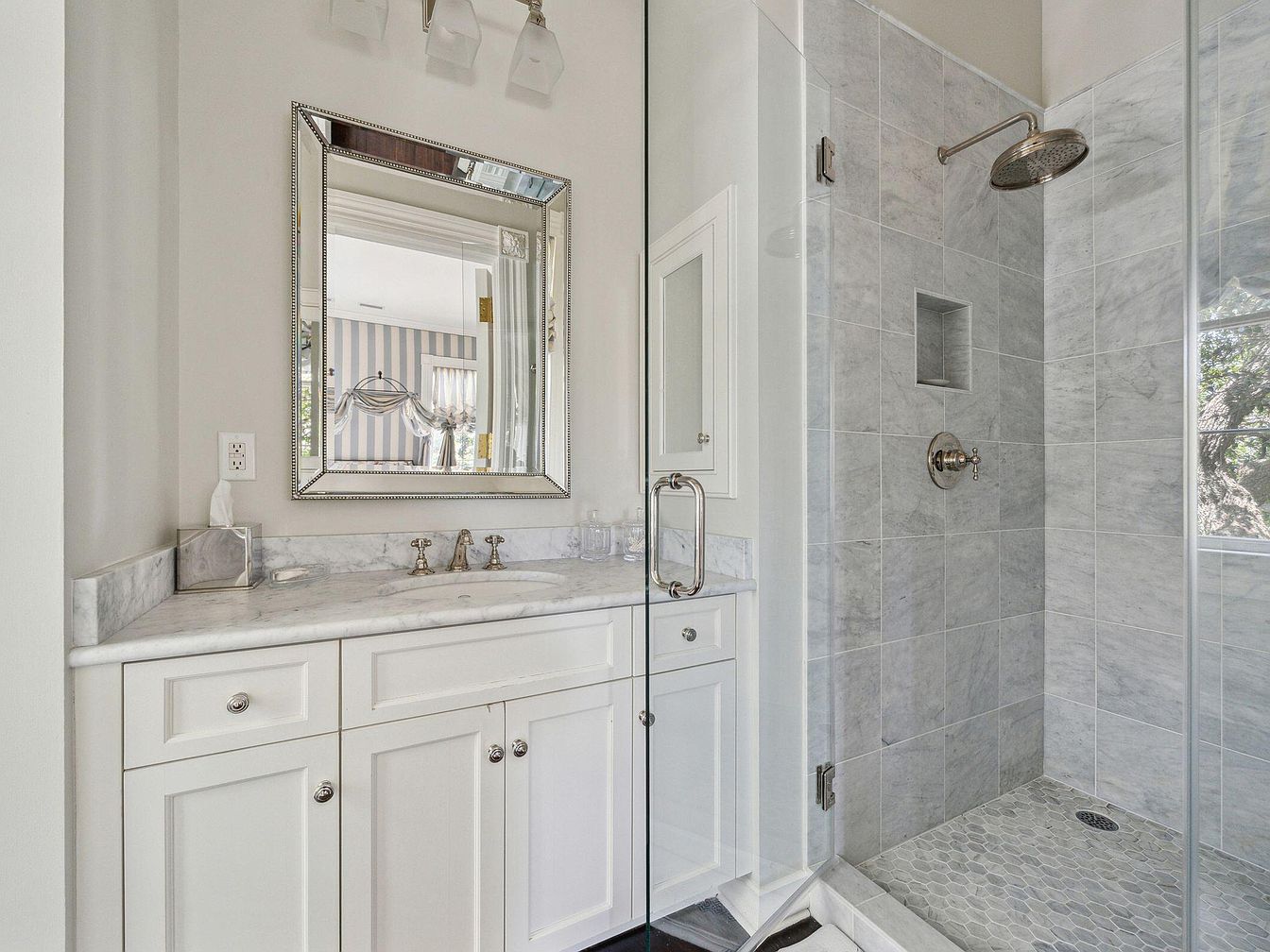 This bathroom features a sophisticated blend of soft white cabinetry and marble countertops, creating an inviting and elegant atmosphere. The walk-in shower boasts large, light-grey tiles and a rainfall showerhead, making it accessible and convenient for family use. A sizable, beveled mirror above the vanity helps reflect light, enhancing the sense of space. Ample storage is provided by drawers and cabinets beneath the sink, keeping daily essentials tucked away. The overall color palette is composed of soothing whites and greys, promoting a tranquil vibe and making the room feel clean, airy, and comfortable for family members of all ages.