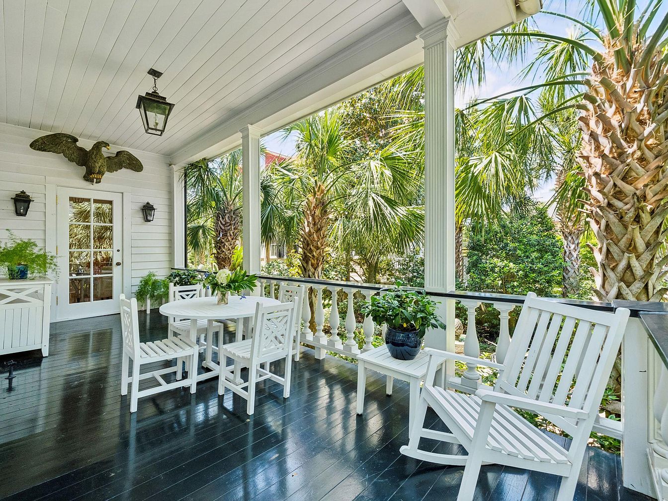 This classic Southern-style front porch feels both inviting and relaxed, ideal for family gatherings and quiet afternoons. Crisp white spindle railings, ceiling, and furniture stand out against the backdrop of high-gloss dark wood floors, capturing a breezy, clean aesthetic. Tall columns frame expansive views of lush palm trees, providing a refreshing sense of privacy and shade. A round table with chairs encourages shared meals or games, complemented by rocking chairs perfect for lounging. Touches of greenery in potted plants enhance the connection to the outdoors, making this space a welcoming extension of the home for all ages.