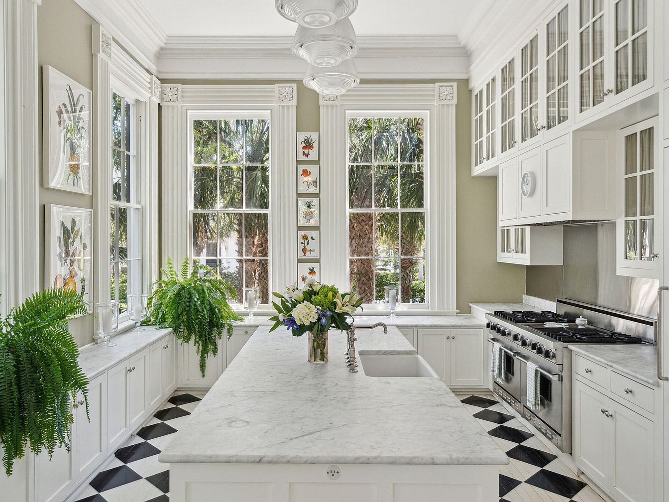 This spacious kitchen blends classic charm with modern function, featuring a marble-topped central island perfect for family gatherings and casual meals. Large windows flood the room with natural light, creating an airy, inviting atmosphere and connecting the space to nature with views of lush palms. Crisp white cabinetry and glass-fronted uppers offer ample storage and display, while botanical prints and vibrant houseplants add freshness and personality. The black-and-white checkered floor brings a timeless, playful touch, ideal for a family-friendly setting. Subtle taupe walls enrich the palette, and top-tier stainless appliances ensure effortless meal prep in style.
