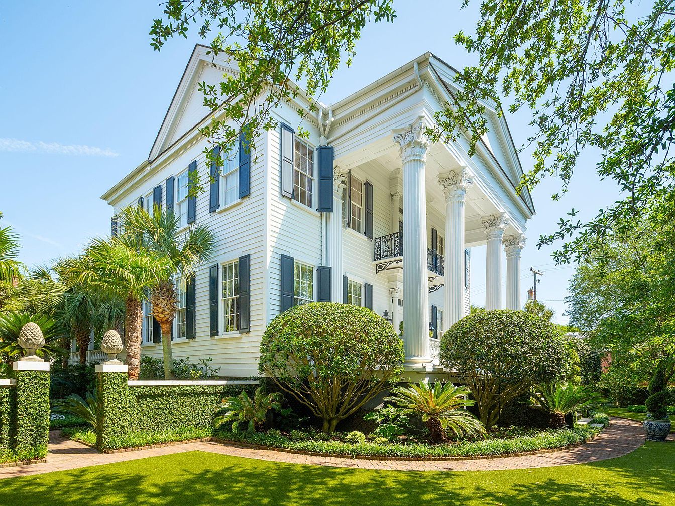 A stately Southern-style front porch greets visitors with its impressive Greek Revival columns and sweeping upper balcony, ideal for family gatherings or relaxing afternoons. The pristine white facade, paired with contrasting black shutters, gives the home a timeless, elegant appearance. Lush, manicured landscaping with neatly trimmed hedges, palm trees, and ornate shrubbery underscores the home’s inviting and secure atmosphere, great for children to play or for outdoor entertaining. Classic brick pathways wind through the garden, while intricate ironwork and decorative pineapple finials lend a welcoming, hospitable touch to this quintessential American home exterior.
