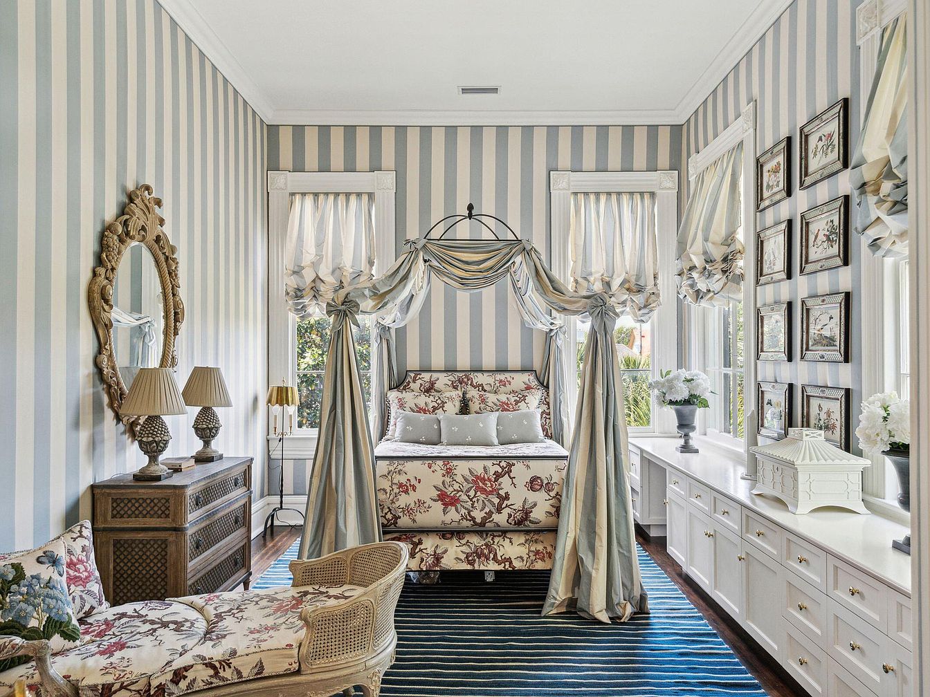 This beautifully styled bedroom combines classic charm with family-friendly comfort. The space features a striking canopy bed adorned with draped, striped fabrics that match the soft blue and white palette of the vertical striped wallpaper. Light streams in through multiple tall windows dressed in ruched curtains, brightening the room and enhancing its airy feel. Elegant furnishings, including a floral-upholstered chaise lounge and dresser with twin lamps, invite relaxation. Ornate details like a carved mirror, botanical artwork, and tasteful decor enhance the room’s graceful aesthetic, while abundant built-in cabinetry offers practical storage for a tidy, organized family home.