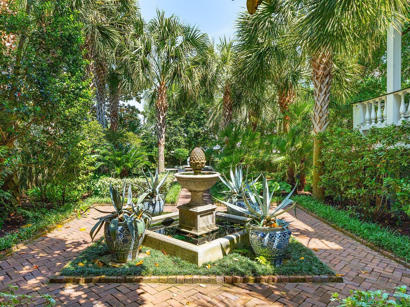This lush garden features a tranquil fountain at its center, surrounded by vibrant greenery and mature palm trees that offer dappled shade. Brick pathways form a symmetrical layout, inviting leisurely strolls and making the space easy to navigate for all ages. Decorative blue-and-white planters filled with sculptural agave plants add artistic flair and a sense of order. The balustrade along the side hints at classic Southern or Mediterranean architecture, blending elegance with a relaxed, family-friendly atmosphere. This serene outdoor oasis is perfect for gatherings, quiet reflection, or children’s play amidst nature’s beauty.