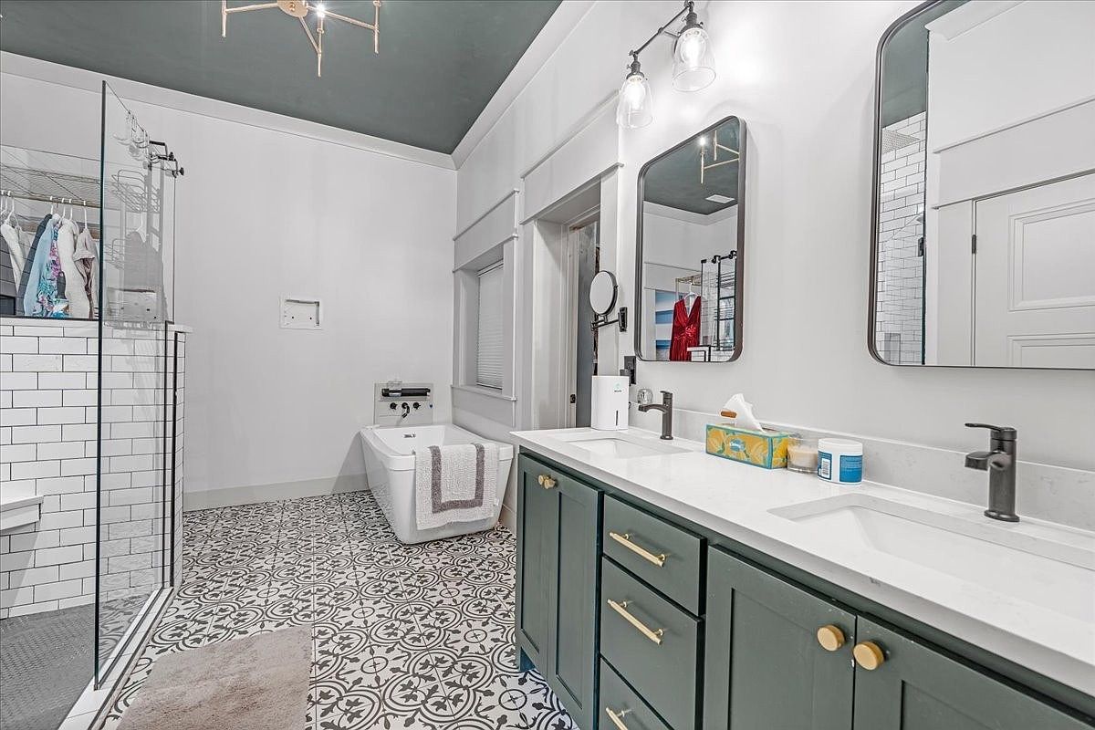 This spacious bathroom showcases a blend of contemporary and classic design elements. A double sink vanity with rich green cabinetry features gold hardware, complementing the elegant marble countertop. Stylish round mirrors enhance the visual appeal while providing functionality. The shower area, enclosed with clear glass, highlights white subway tiles, creating a clean and bright look. A freestanding bathtub invites relaxation, surrounded by patterned tile flooring that adds a touch of sophistication. The soft blue ceiling contrasts beautifully with the crisp white walls, ensuring a serene ambiance. Thoughtful lighting fixtures provide ample brightness, enhancing the overall atmosphere.
