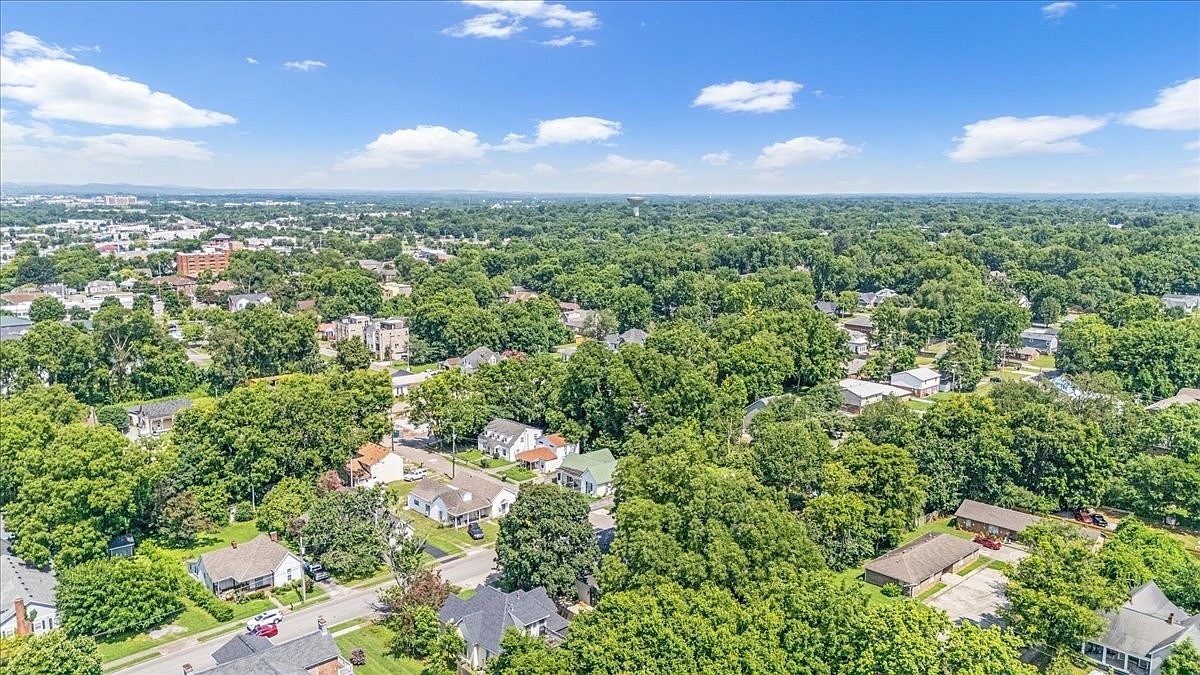 This vibrant aerial view showcases a picturesque American neighborhood, nestled among lush greenery. The homes exhibit a mix of architectural styles, from charming bungalows to modern structures, each harmonizing with the surrounding landscape. Streets lined with trees enhance the inviting atmosphere, perfect for family walks and outdoor activities. The color palette is dominated by earthy tones, complemented by the bright greens of the foliage. Nearby amenities and parks are visible, highlighting the community’s family-friendly environment. Abundant natural light filters through the treetops, creating a warm and welcoming feeling throughout the neighborhood.
