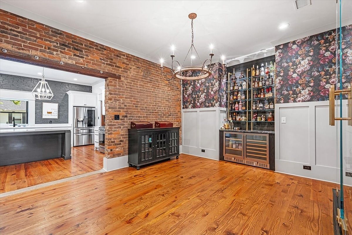 This inviting bar area combines rustic and modern aesthetics, featuring exposed brick walls that add warmth and character. A decorative floral wallpaper contrasts beautifully with the dark cabinetry and sleek glass shelving, showcasing a curated selection of beverages. The warm, hardwood flooring complements the space, while a stylish chandelier illuminates the area, enhancing its welcoming vibe. Conveniently connected to the kitchen, this space is designed for entertaining and family gatherings, with ample space for bar stools. Thoughtfully placed cabinetry ensures storage for glassware and supplies, making it both functional and visually appealing.