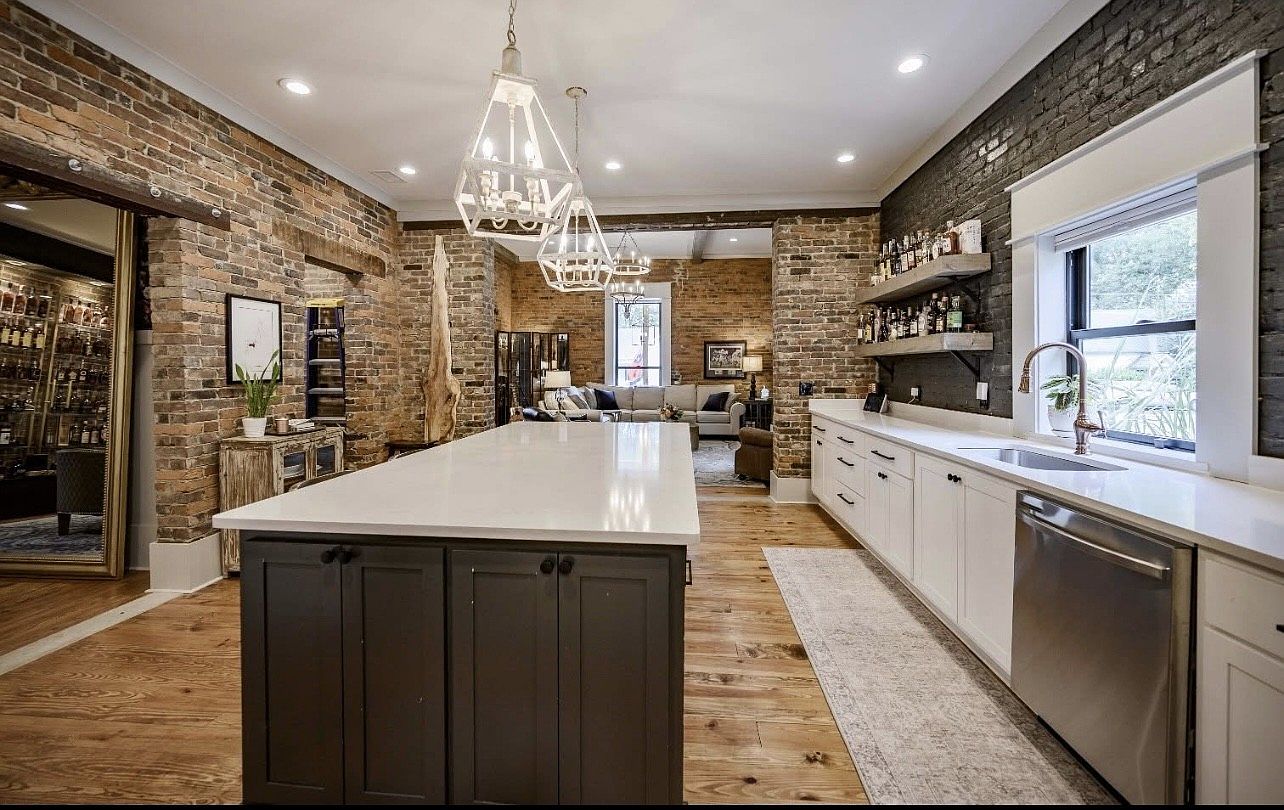 This stunning kitchen features a harmonious blend of modern and rustic elements, highlighted by exposed reddish-brown brick walls and elegant white cabinetry. A spacious island invites gatherings, showcasing a sleek countertop that contrasts beautifully with darker lower cabinets. Natural light floods through the window, illuminating the area where stylish fixtures hang above, adding charm and warmth. The open layout seamlessly connects to a cozy living area, promoting family interaction. Elements like the wooden shelving and textural contrasts create a welcoming atmosphere, making this kitchen a perfect heart of the home for culinary adventures and family bonding.