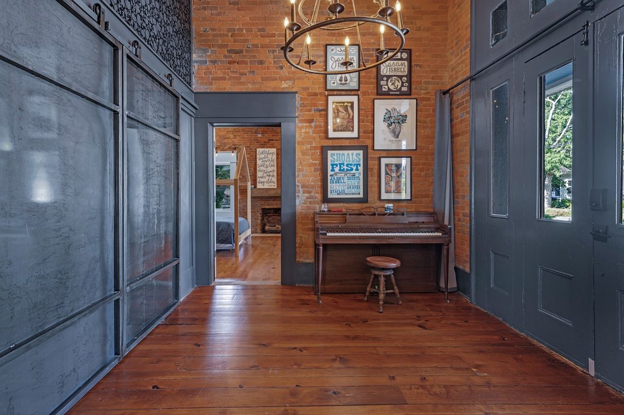 Entering this home reveals a spacious entryway that blends modern and rustic aesthetics effortlessly. Exposed brick walls provide a warm, inviting backdrop, complemented by the rich, polished hardwood floor. A unique chandelier hangs above, casting a soft glow, while the dark trim enhances the architectural details. A charming vintage piano rests against the wall, adding a touch of personality and encouraging family gatherings. Framed art pieces in various styles decorate the walls, showcasing creativity and making it feel lived-in. The large double doors open to the outside, ensuring natural light fills the space, perfect for welcoming guests.