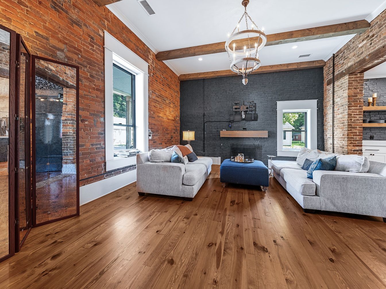 This inviting living room features an elegant blend of modern and rustic design, highlighted by rich exposed brick walls and dark accent panels. The spacious layout encourages family gatherings, centered around plush gray sofas adorned with decorative cushions, providing comfort and style. A striking chandelier hangs from the high ceiling, casting a warm glow over the room. The hardwood flooring adds warmth, enhancing the overall cozy atmosphere. An eye-catching coffee table sits in the middle, perfect for casual gatherings. Ample natural light floods through large windows, seamlessly connecting indoor elegance with the outdoor scenery.