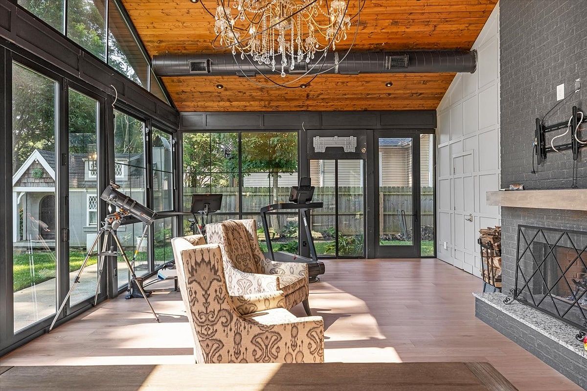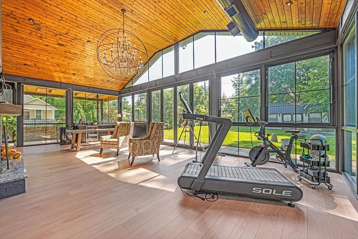 This inviting sunroom combines relaxation and fitness, featuring a stunning vaulted wooden ceiling that enhances the open atmosphere. Expansive floor-to-ceiling windows flood the space with natural light, showcasing views of the lush outdoor landscape. Two elegant chairs with intricate patterns provide a cozy spot to unwind, while a sleek treadmill and a stationary bike cater to active lifestyles. The hardwood flooring adds warmth and continuity, contrasting perfectly with the modern workout equipment. Decorative elements like a chic chandelier accentuate the room’s style, ensuring a family-friendly area that blends comfort, wellness, and aesthetic appeal.
