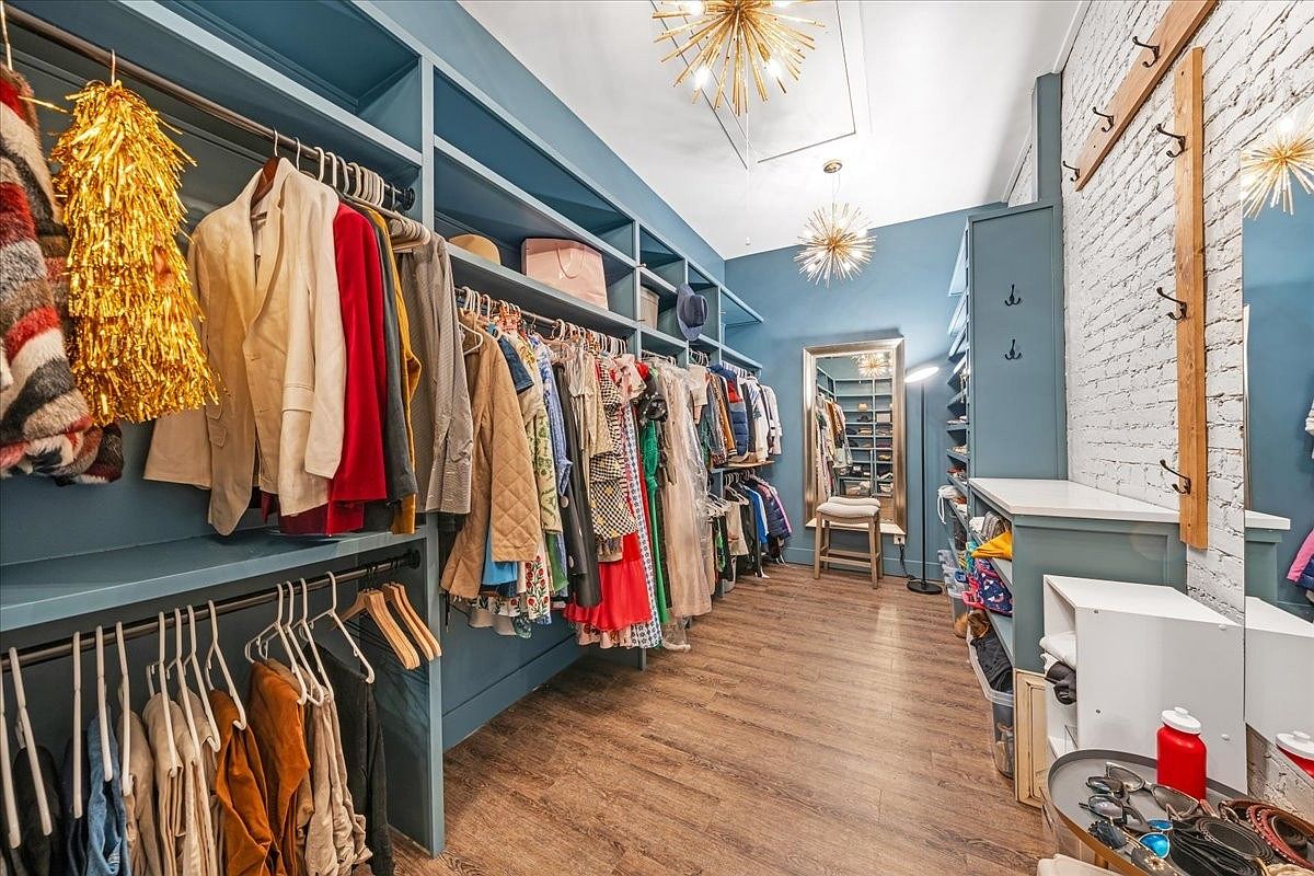 This walk-in closet features a thoughtful design that maximizes space while maintaining stylish elegance. Deep blue walls create a calming backdrop for neatly organized clothing, displayed on sturdy wooden hangers and accented with open shelving. Ample storage options include lower shelves and built-in hooks for bags and accessories, ensuring a clutter-free environment. The rich wood flooring adds warmth, complementing the chic elements like the starburst light fixtures above. A full-length mirror enhances the sense of space, while a cozy chair offers a convenient spot for outfit planning, making this closet a luxurious and functional retreat.