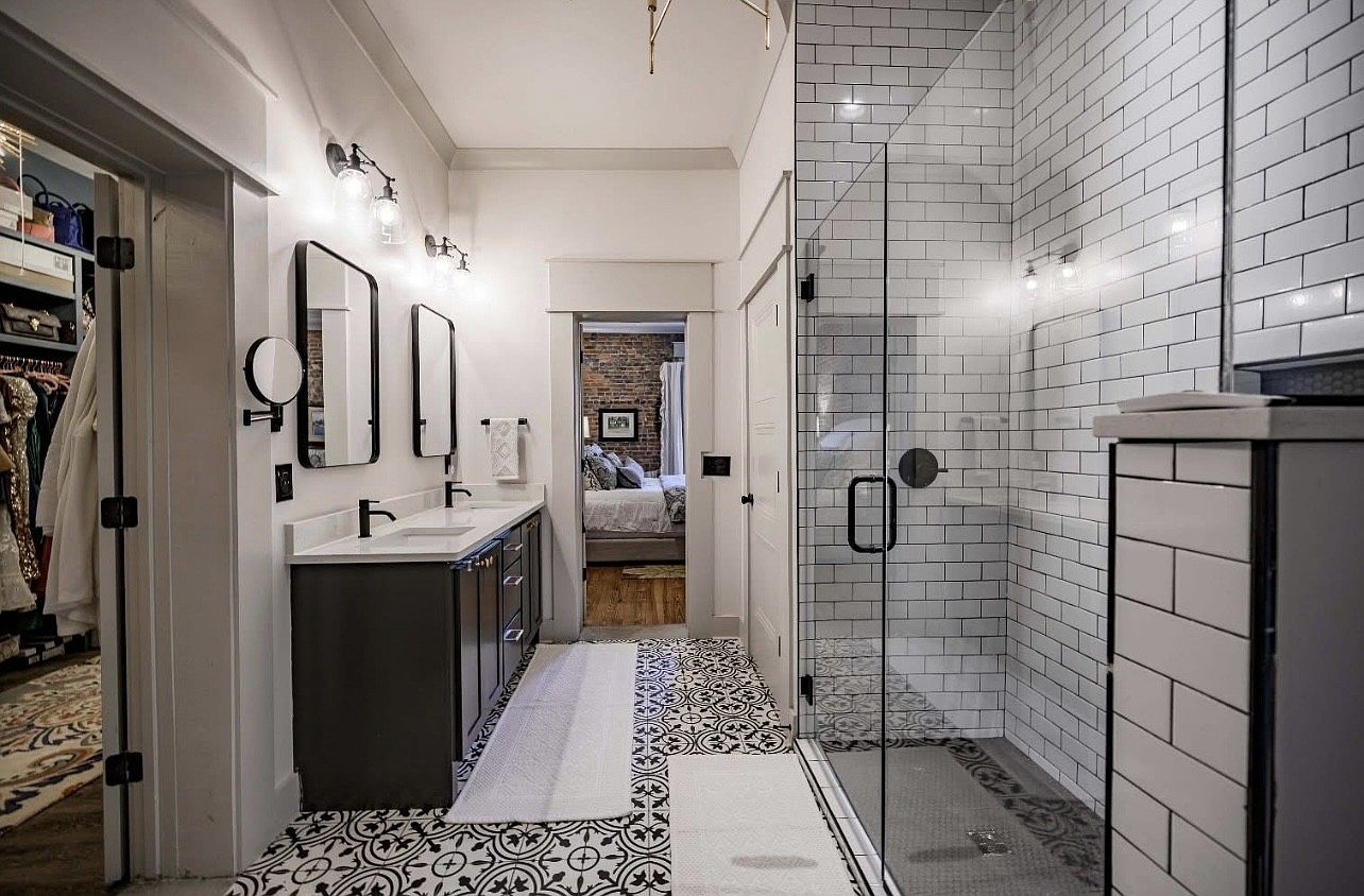 This elegant bathroom showcases a harmonious blend of modern and vintage design elements, highlighted by a spacious layout. Dual sinks are framed by chic black mirrors and accentuated by stylish wall-mounted lighting, creating a bright and inviting atmosphere. The striking patterned floor tiles add artistic flair, while the glass shower enclosure features classic white subway tiles, emphasizing cleanliness. Storage solutions include a sleek vanity with ample space, ideal for family needs. The open doorway in the background leads to a cozy bedroom, enhancing the home’s connected and family-friendly vibe, making it a perfect retreat for relaxation.