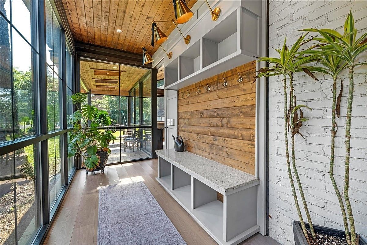 This beautifully designed mudroom features a harmonious blend of rustic and modern elements. The stunning wooden ceiling cleverly contrasts with the sleek, white-brick wall, creating a warm and inviting atmosphere. A spacious bench with a quartz countertop serves both form and function, providing ample space for outdoor gear storage below. Stylish gold-accented lighting fixtures enhance the space’s elegance, while wall hooks offer convenience for hanging coats and bags. Vibrant indoor plants add a refreshing touch of nature, making this area not only practical but also welcoming for families. The large windows invite natural light, enhancing the overall cheerfulness.
