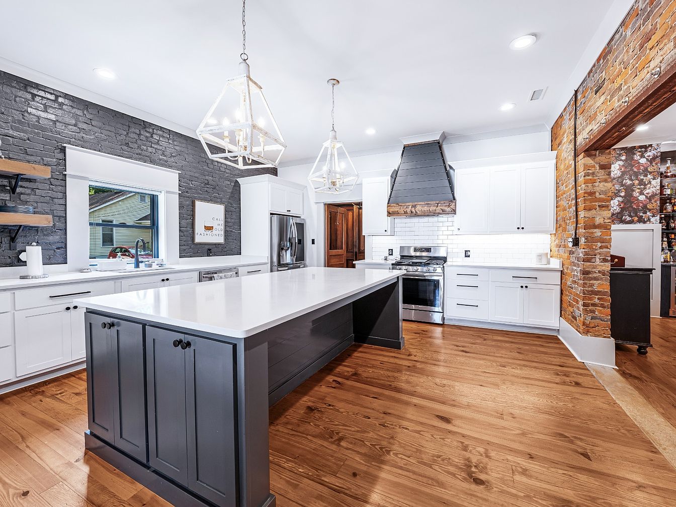 This modern kitchen seamlessly blends contemporary and rustic elements, showcasing a spacious layout that’s perfect for family gatherings. The striking contrast between the dark brick accent wall and the crisp white cabinetry creates a fresh aesthetic. A large island with a sleek quartz countertop serves as a multifunctional space for meal preparation and casual dining. Pendant lights hang elegantly above, providing both illumination and style. The exposed brick chimney adds warmth, while hardwood floors enhance the inviting atmosphere. Ample storage and open shelving ensure practicality, making this kitchen an ideal heart of the home.