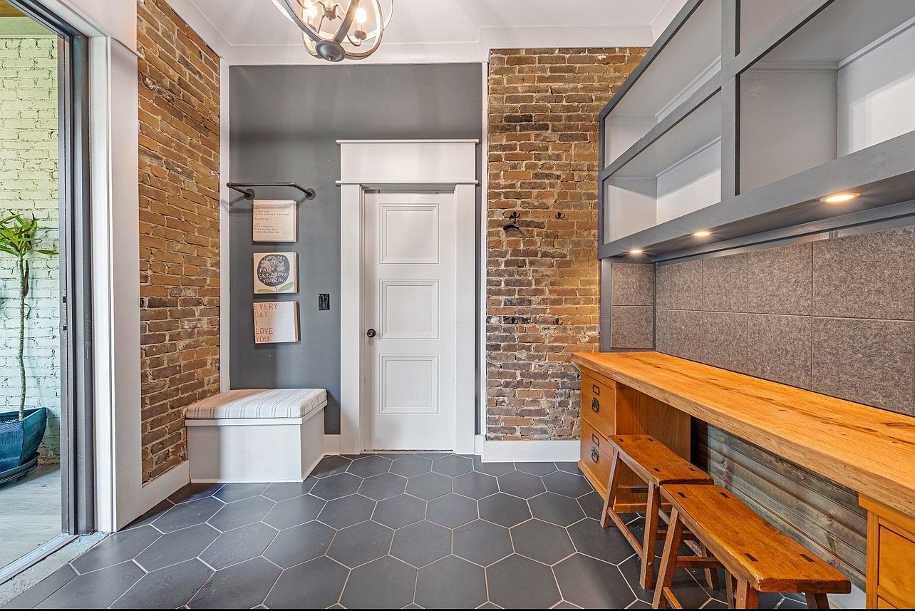 This inviting mudroom combines functionality with modern aesthetics, featuring a blend of textured materials. Exposed brick walls add rustic charm, while a sleek gray color scheme provides a contemporary feel. The patterned hexagonal floor tiles create visual interest, anchoring the space beautifully. A wooden bench offers a comfortable spot for seating, paired with stylish stools for extra utility. Minimalist shelving above provides practical storage without overwhelming the design. Thoughtful wall accents, including framed quotes, add a personal touch, transforming this hallway into a welcoming transition area for family and guests alike.