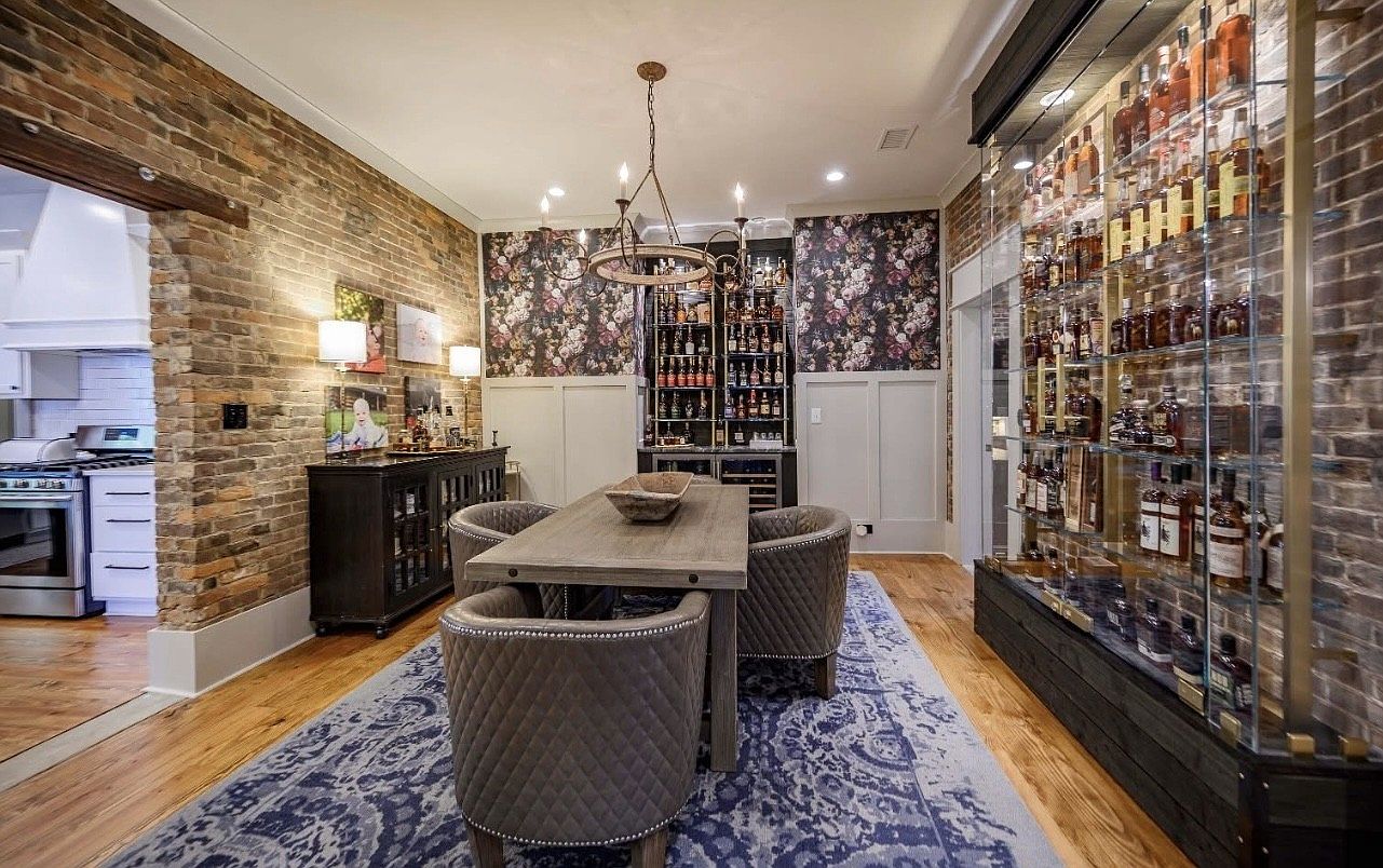 This charming wine room features a rustic brick accent wall that enhances the warm, inviting atmosphere. A large, sturdy wooden dining table is surrounded by plush, quilted chairs, providing a cozy spot for family gatherings and tastings. The room is beautifully complemented by elegant floral wallpaper, adding a touch of sophistication. A glass display cabinet showcases a curated collection of fine spirits, while strategically placed lighting casts a warm glow, highlighting the unique textures. Natural wood flooring ties the space together, creating a relaxing environment perfect for both entertaining and intimate family moments.
