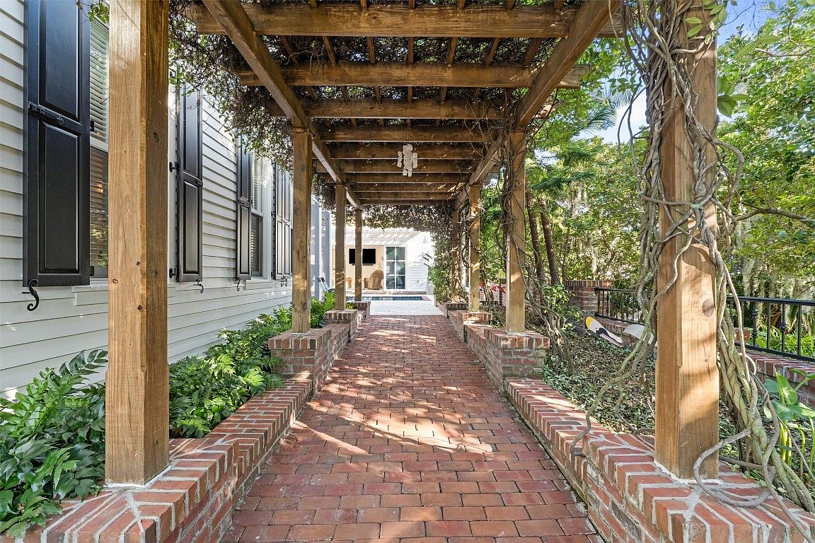 A welcoming entryway, framed by a beautifully constructed wooden pergola, invites you along a cozy brick pathway. The lush greenery on either side enhances the outdoor experience, bringing nature’s tranquility close. Classic black shutters contrast elegantly with the light-colored siding of the home, creating a warm and inviting atmosphere. Family-friendly features include ample seating just beyond the pergola, ideal for relaxing or entertaining. The carefully landscaped surroundings ensure a picturesque view, while thoughtful architectural details, like the vintage-style lighting and brick walls, add character and charm, making this entryway both functional and aesthetically pleasing.