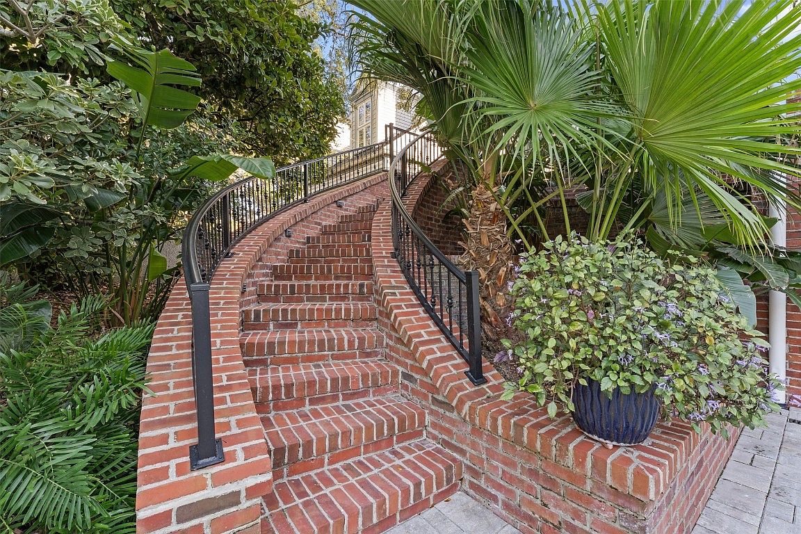 This beautifully designed staircase entrance features elegant, curved brick steps that invite guests into the home. The rich red bricks create a warm, welcoming feel, complemented by a stylish black wrought iron railing, ensuring safety while enhancing the aesthetic appeal. Lush greenery, including palm leaves and vibrant plants, frames the staircase, adding a touch of nature and tranquility. The surrounding landscape provides a lush backdrop, making the open-air transition to the home feel seamless and inviting. This family-friendly feature allows for easy access in a serene environment, perfect for gatherings or casual family strolls.