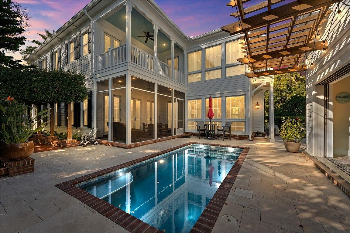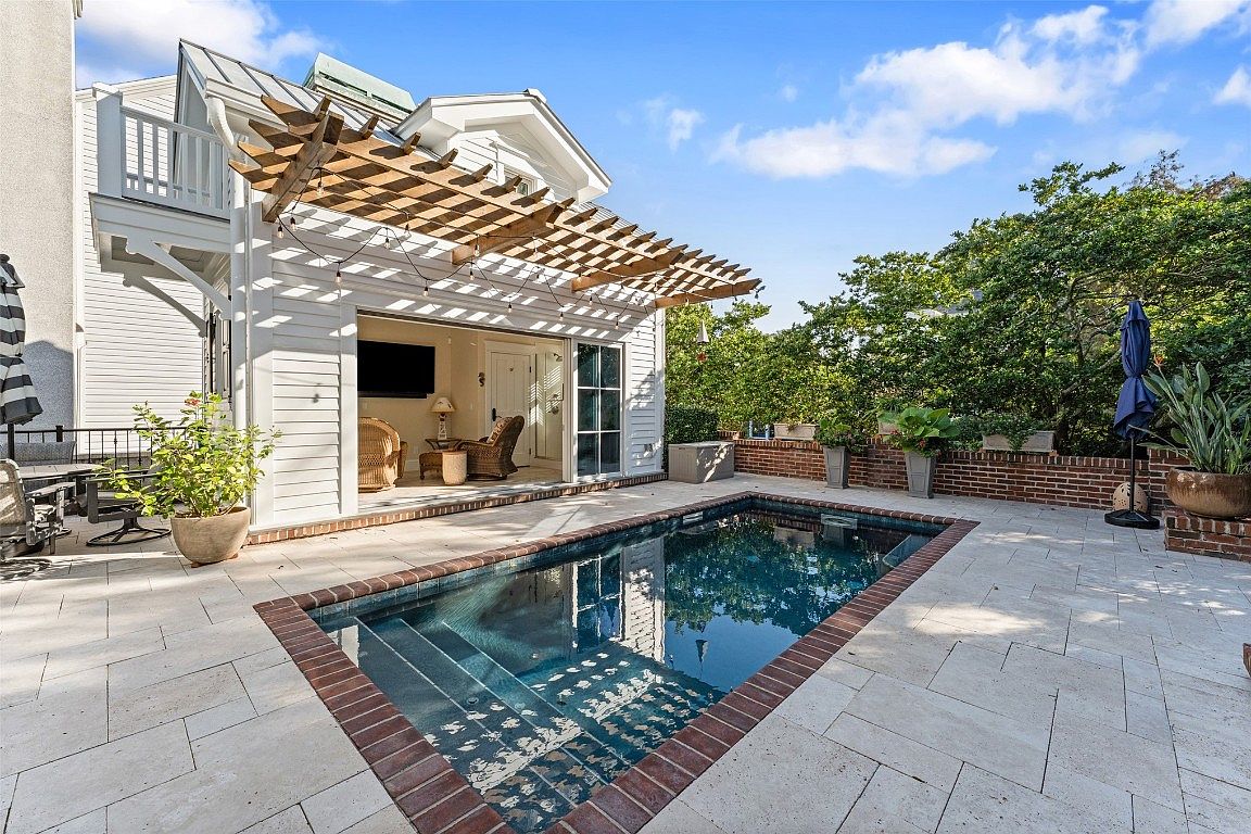 This serene backyard oasis features a refreshing pool, elegantly framed by stone pavers and bordered with classic brick detailing. Ideal for family gatherings, the screened-in porch offers comfortable seating with a vibrant view of the water. Large, bright windows invite natural light into the adjoining rooms, enhancing the cheerful ambiance. A stylish table set beneath a red umbrella creates a cozy dining area for outdoor meals. Lush landscaping and carefully positioned plants add a touch of tranquility, making this space perfect for relaxing afternoons and evening entertainment. The architectural elements uphold a charming coastal vibe, ensuring both beauty and functionality.