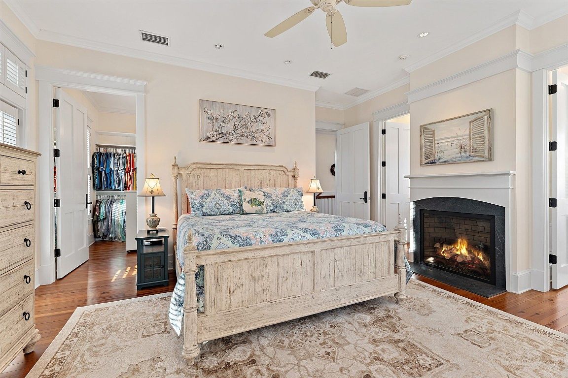 This master bedroom blends comfort with elegance, featuring a charming, weathered wood bed frame adorned with a soft, patterned quilt. A cozy seating area by the fireplace adds warmth, creating an inviting atmosphere. The room showcases a neutral color palette with light cream walls that brighten the space, paired with a beautiful area rug that adds texture. Thoughtfully placed lamps provide soft lighting, enhancing the tranquil vibe. A spacious closet, accessed through a stylish door, ensures ample storage, while decorative art pieces contribute to the room’s serene aesthetic, making it an idyllic retreat for relaxation.