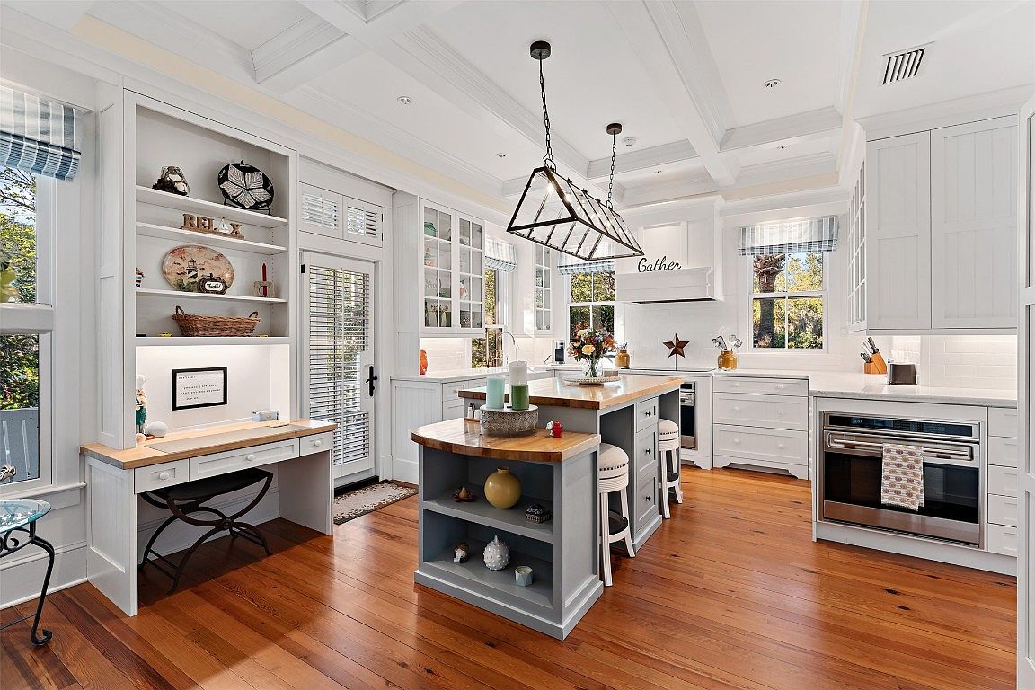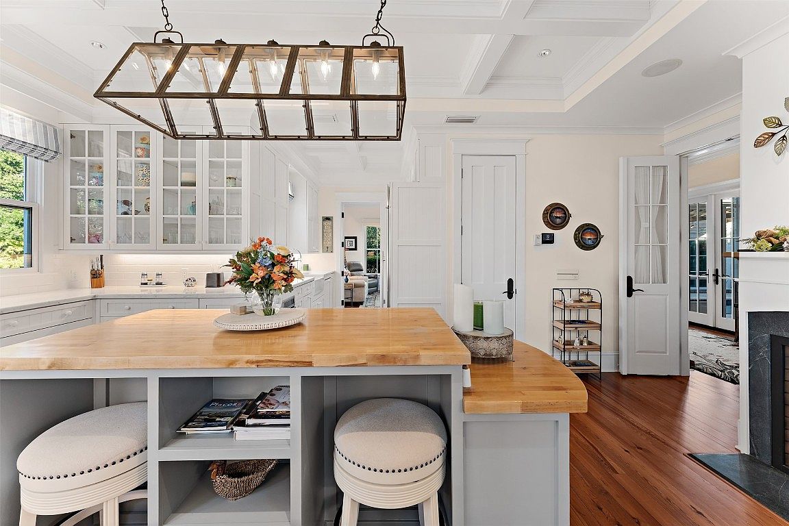 This inviting kitchen features a spacious layout with an elegant blend of functionality and style. The centerpiece is a handsome wooden island that invites casual dining, complemented by plush upholstered stools, ideal for family gatherings. The cabinetry, with its crisp white finish and glass-panel doors, showcases a collection of colorful dishware, adding a cheerful touch. Soft natural light floods in through the windows, enhancing the warm tones of the hardwood flooring. Architectural details such as coffered ceilings elevate the aesthetic, while the stylish pendant lighting above the island provides both ambiance and practicality.