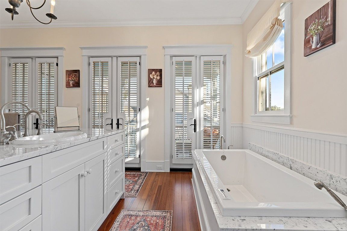 This exquisite bathroom combines modern elegance with timeless charm. Featuring a spacious vanity topped with glistening white marble, it offers ample storage within soft-close cabinetry. Large windows dressed with subtle shades allow natural light to flood in, highlighting the warm tones of the hardwood flooring. The luxurious soaking tub is strategically placed for a relaxing view, while stylish artwork adds a touch of personality. Shutters provide privacy and control over light, creating a tranquil atmosphere. The neutral color palette fosters a serene environment, making this space perfect for unwinding after a long day, seamlessly blending comfort and sophistication.