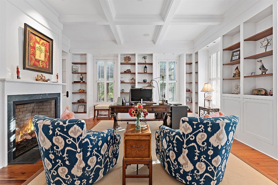 This beautifully designed home office combines elegance and functionality, featuring bold blue and white patterned chairs that invite comfort. The room boasts a warm wood floor that complements the classic coffered ceiling, creating a spacious feel. Built-in shelves flanking the workspace provide ample storage for books and decorative items, enhancing organization. Natural light floods the room through large windows adorned with plantation shutters, promoting a cheerful atmosphere. A charming wooden desk serves as the focal point, equipped for productivity. Subtle accents like the fireplace and floral arrangement add a welcoming touch, making this space ideal for both work and relaxation.