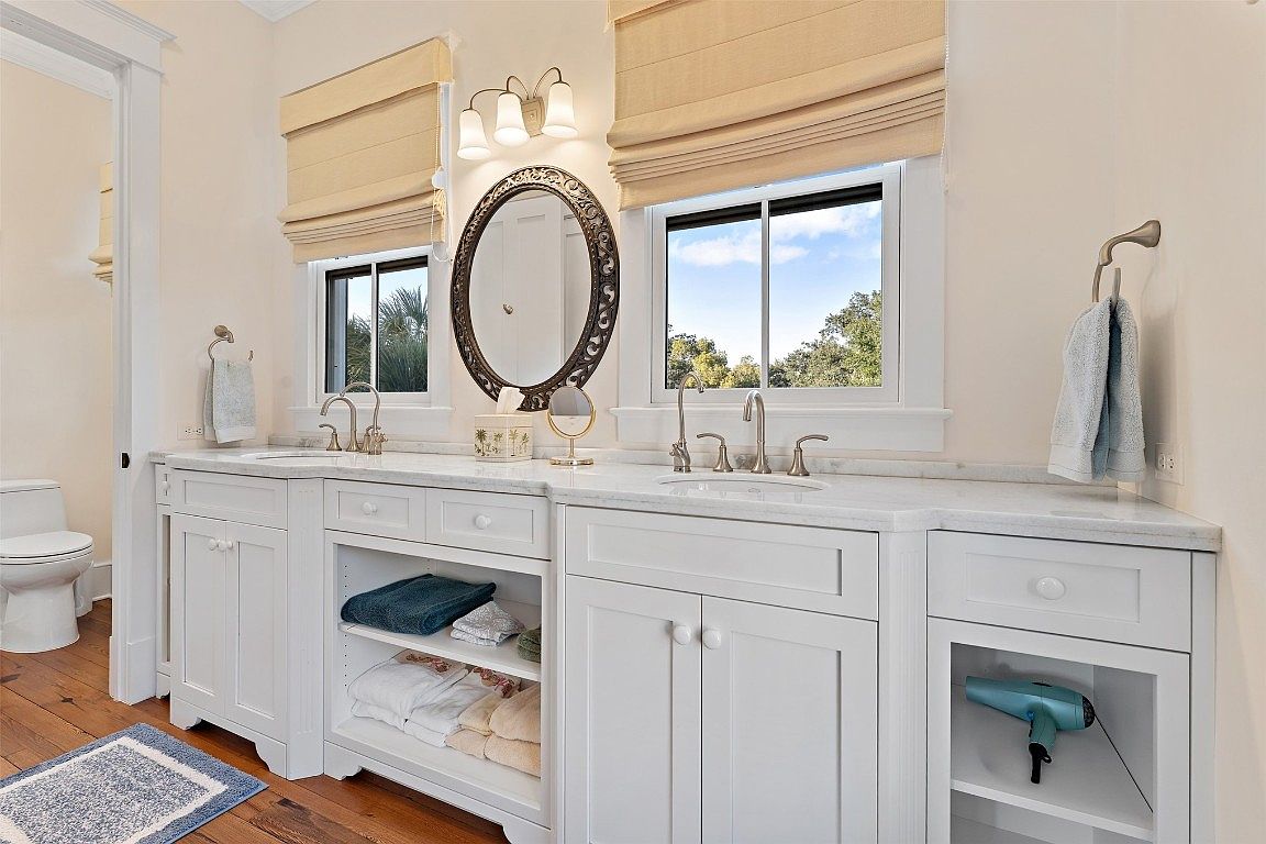 This spacious master bathroom showcases a beautifully designed vanity area, featuring elegant white cabinetry and a stunning marble countertop. The dual sinks are complemented by tasteful faucet fixtures, enhancing the modern aesthetic. Sunlight floods the space through large windows adorned with soft, neutral-tone Roman shades, offering both privacy and natural light. A round decorative mirror adds a touch of sophistication, while organized shelving below displays neatly folded towels in calming colors. The warm hardwood flooring beneath provides a cozy contrast to the overall light palette, creating a welcoming and family-friendly atmosphere that invites relaxation and rejuvenation.