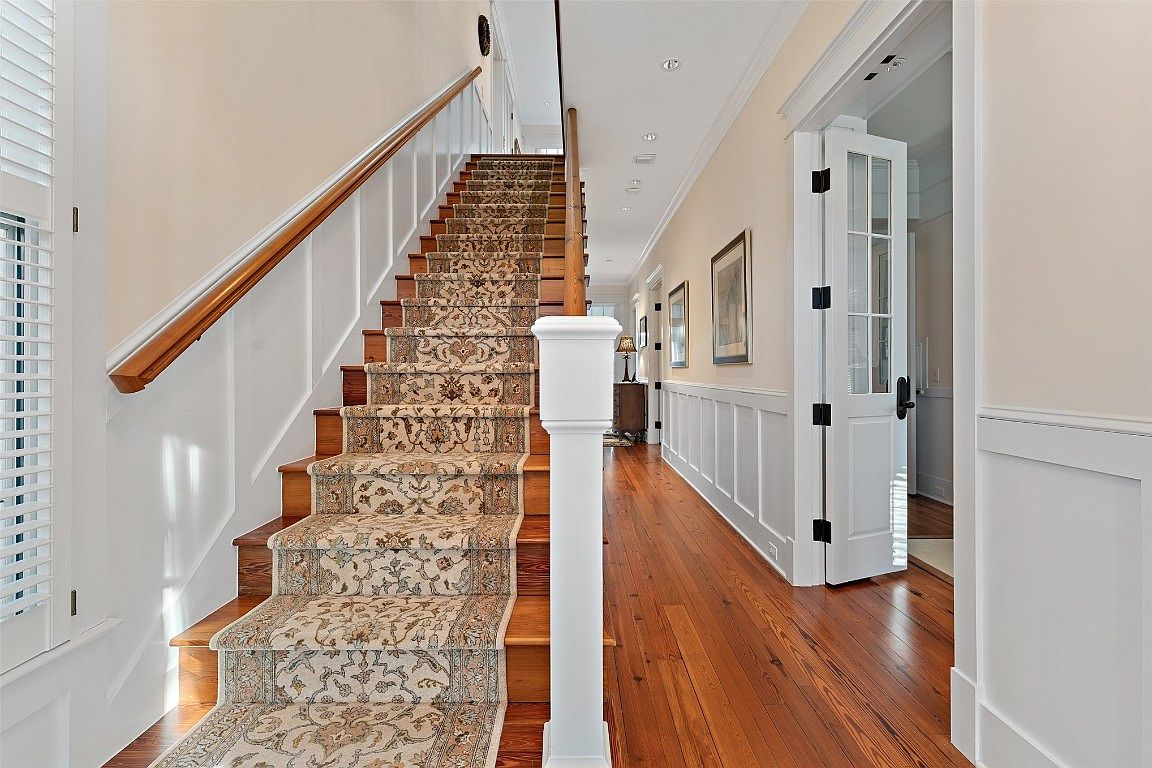 This inviting staircase features a plush, patterned runner that elegantly contrasts with the rich wooden steps, enhancing the home’s warm aesthetic. The open layout allows for easy transition between the different spaces, with sunlight streaming in through the nearby windows. White wainscoting adds a touch of classic charm, while the sleek wooden railings provide both safety and style. Family-friendly features include ample space for children to traverse and play, alongside tasteful artwork adorning the walls that adds personality. The overall color palette is soothing, with soft neutrals complemented by the warmth of natural wood, creating a welcoming atmosphere.