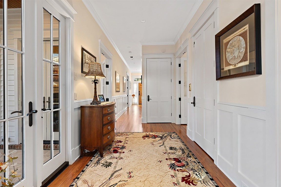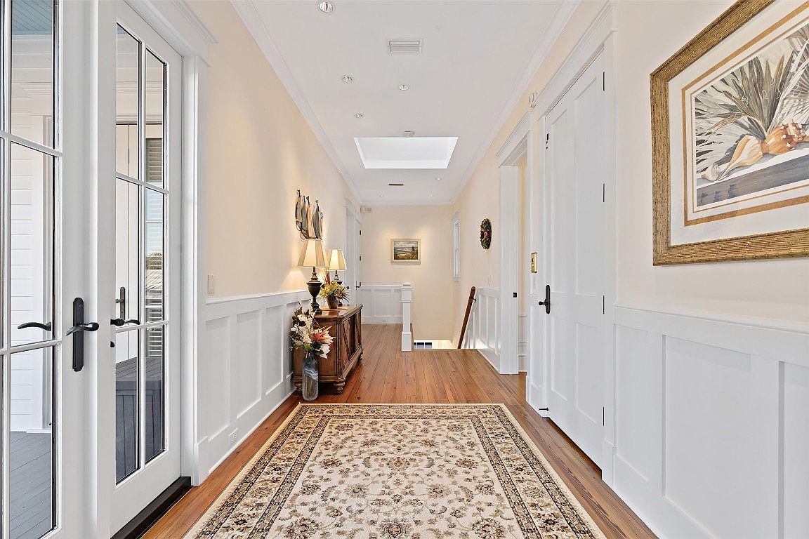 This inviting foyer showcases a harmonious blend of modern and classic design elements. A beautifully crafted hardwood floor runs throughout, while white wainscoting and soft beige walls add warmth and sophistication. The space features a statement area rug that provides comfort and style, leading to an elegant wooden console table adorned with fresh flowers, enhancing the welcoming atmosphere. Natural light floods in through the large glass doors and skylight, brightening the passageway. The layout is open, connecting seamlessly to the living areas, perfect for family gatherings. Decorative artworks and thoughtful accents create a homey touch.