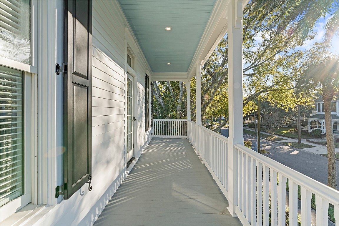 This charming porch offers a perfect blend of outdoor relaxation and aesthetic appeal. Featuring a spacious, lightly colored wooden floor, the area is accentuated by the soft turquoise ceiling, inviting natural light to dance across the surfaces. White railings provide a crisp contrast to the home’s siding, enhancing its classic charm. Black shutters flank the windows, adding depth to the facade. Lush greenery from nearby trees frames the view, creating a serene backdrop. This outdoor space is ideal for family gatherings or quiet evenings, showcasing the home’s welcoming vibe and thoughtful design, perfect for fostering connection.