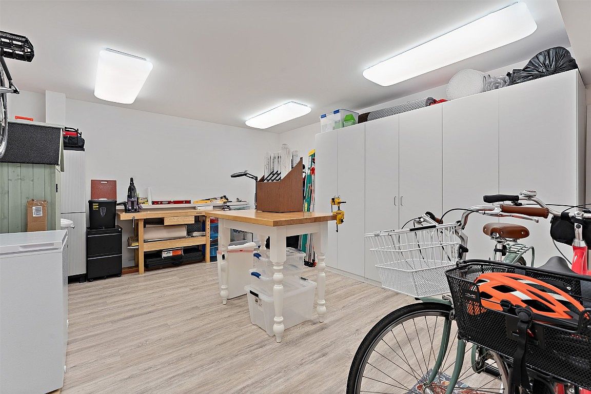 This well-organized workshop exudes efficiency and creativity. A generous workspace is highlighted by a sturdy wooden workbench, positioned centrally, ideal for home projects. The light color scheme, featuring soft whites and natural wood tones, enhances the room’s luminosity and creates a welcoming atmosphere. Ample storage is provided by sleek white cabinets, ensuring that tools and supplies are easily accessible but neatly tucked away. The polished wood flooring adds a touch of warmth, while the overhead LED lighting brightens every corner. Bicycles and equipment reflect a family-friendly environment, suggesting this space is perfect for hands-on activities and hobbies.