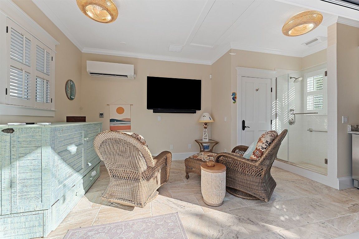 A cozy family room designed for relaxation and warmth. Natural light floods the space through adorned windows, showcasing a soft beige color palette that creates an inviting atmosphere. Two comfortable wicker chairs, upholstered in a playful fabric, sit side by side, while a small round table offers convenience. An eye-catching aqua sideboard adds a stylish touch and practical storage. A modern flat-screen television is mounted on the wall, perfect for family gatherings. The cleverly designed layout leads to an adjoining bath, seamlessly integrating indoor comfort with the possibilities of outdoor living.