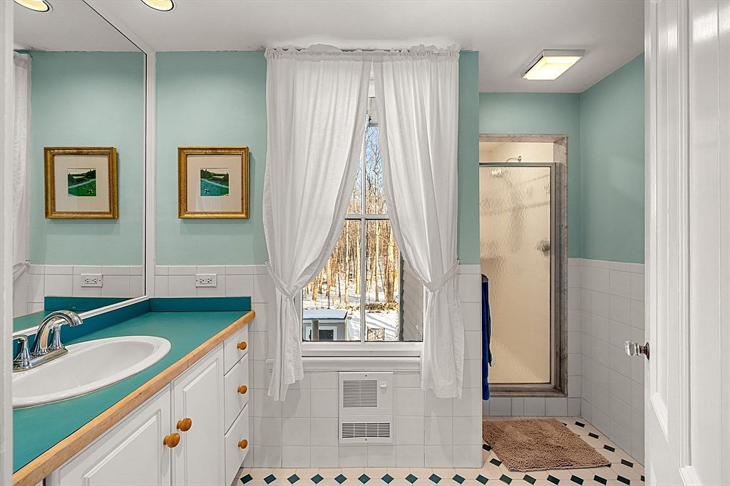 A tranquil bathroom space featuring a distinctive layout that combines functionality with a soothing aesthetic. Soft aqua walls paired seamlessly with white cabinetry create a refreshing ambiance. The counter, adorned with a deep turquoise finish, contrasts beautifully against the classic white tiles that frame the shower area. Natural light floods in through a large window, accentuated by airy white drapes, providing a view of serene outdoor greenery. Framed landscape art adds a touch of personality. Family-friendly elements, such as non-slip tiles and ample storage, elevate this thoughtfully designed retreat, blending comfort with contemporary style.